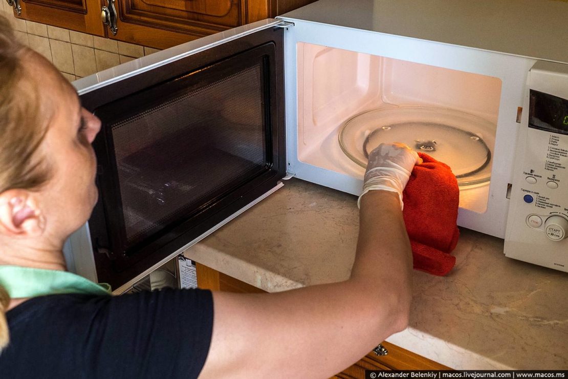 Кстати, средство для стекол отлично очищает не только поверхность камеры, но и ручки, кнопки, стекла и чашу. Желательно оставить дверцу печи открытой на некоторое время. Это нужно сделать для того, чтобы выветрился неприятный запах.