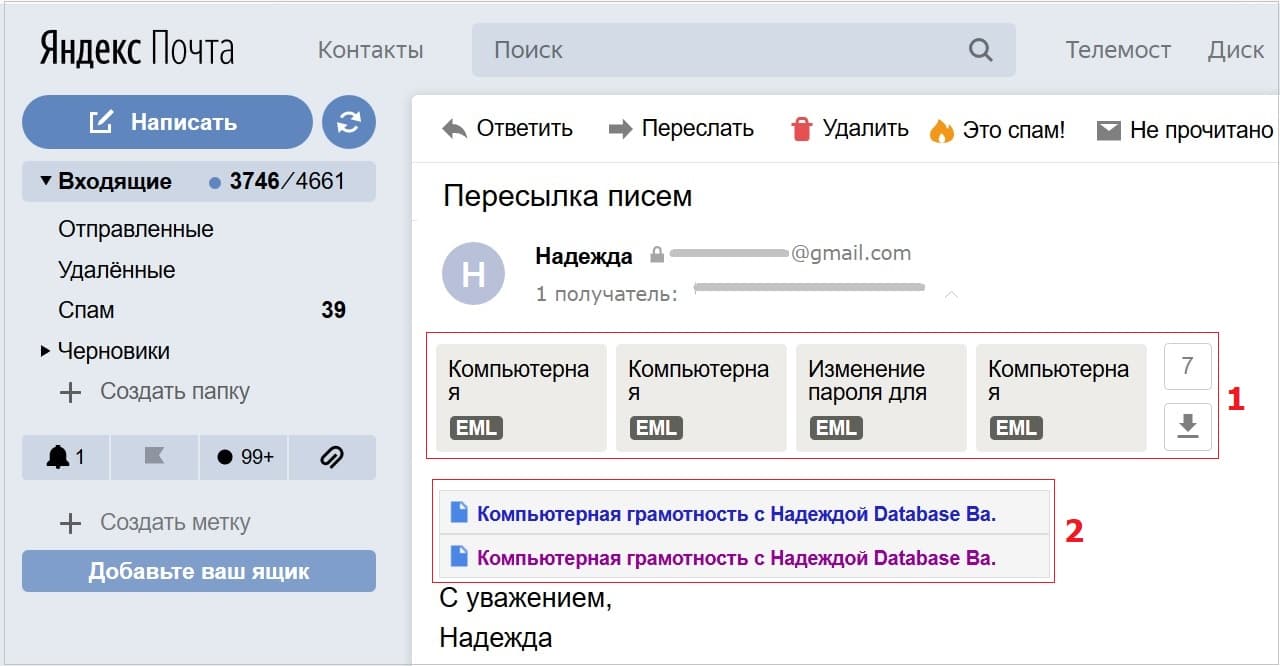 В примере, показанном на рис. 8, девять писем из Гугл почты пересылались на Яндекс.Почту. В открытом письме видно, что семь писем прикреплены к письму (1 на рис. 8). Еще два письма помещены в текст письма в виде ссылок на Гугл Диск (2 на рис. 8).
