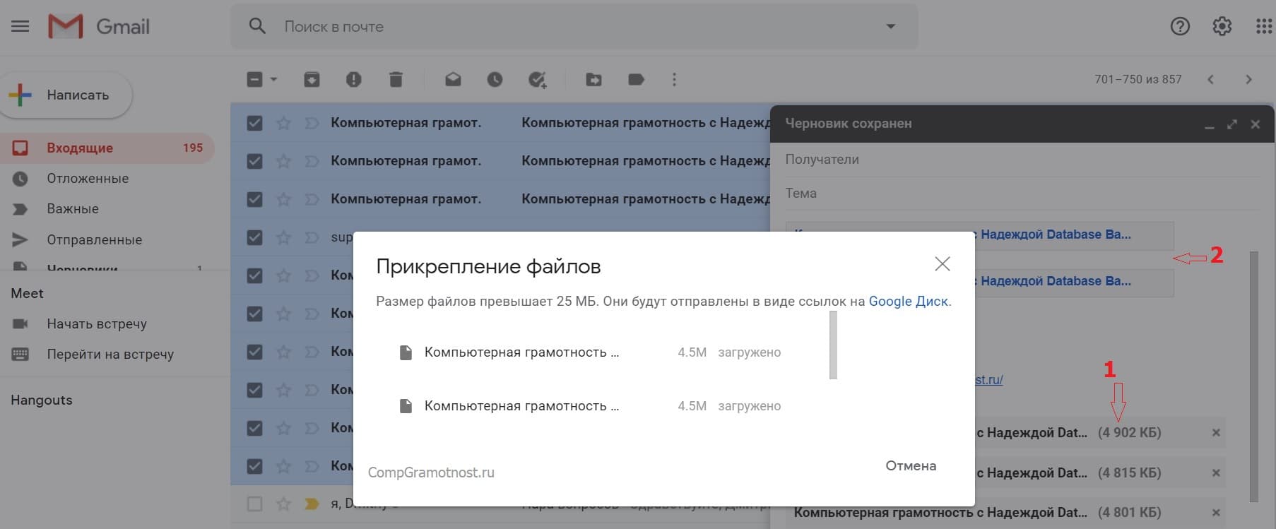 1) Если объем файлов больше, чем 25 мегабайт, тогда файлы к Гугл Диску нужно прикреплять с правом доступа для получателя.
