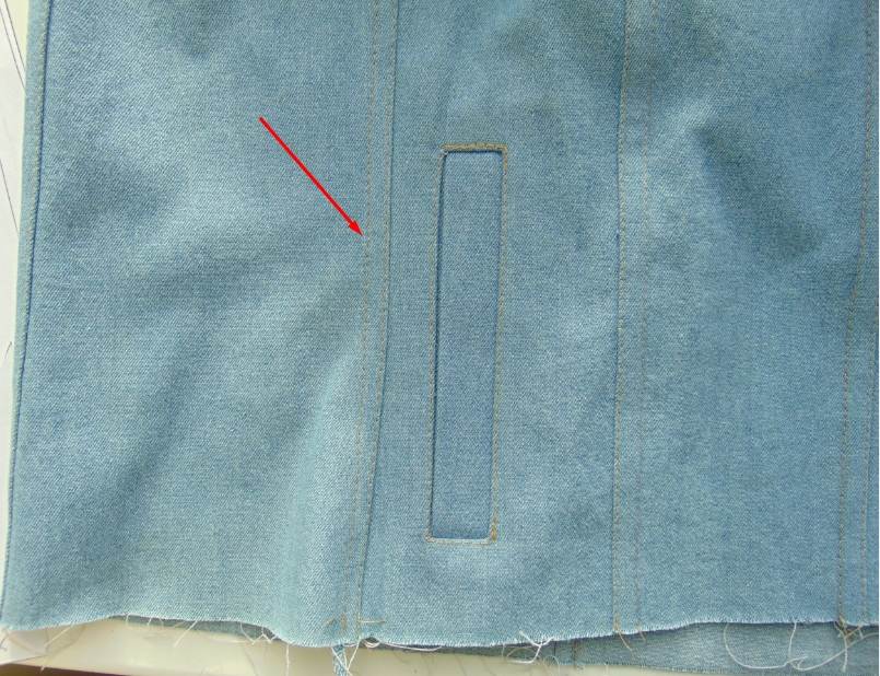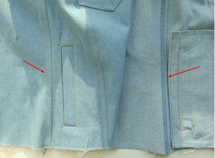 На кофту настрачивают детали джинсовой курточки. При этом начинают с боковых швов. В процессе работы делают вытачки. Задняя часть составляется из двух половин, сшитых между собой в центре.