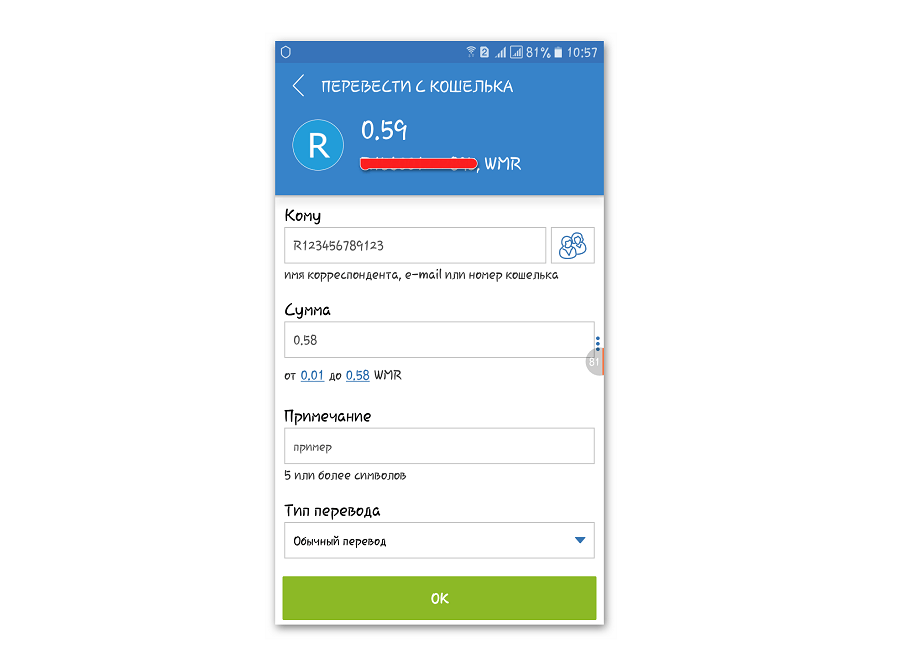После этого откроется окно с информацией о переводе. Здесь нужно указать все то же самое, что мы уже указывали при работе с браузерной версией программы – Вебмани Кипер Стандарт. Это кошелек получателя, сумма, примечание и тип перевода. Нажмите большую кнопку «ОК» внизу окна программы.