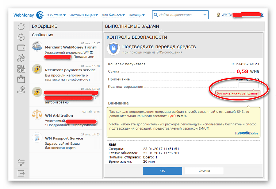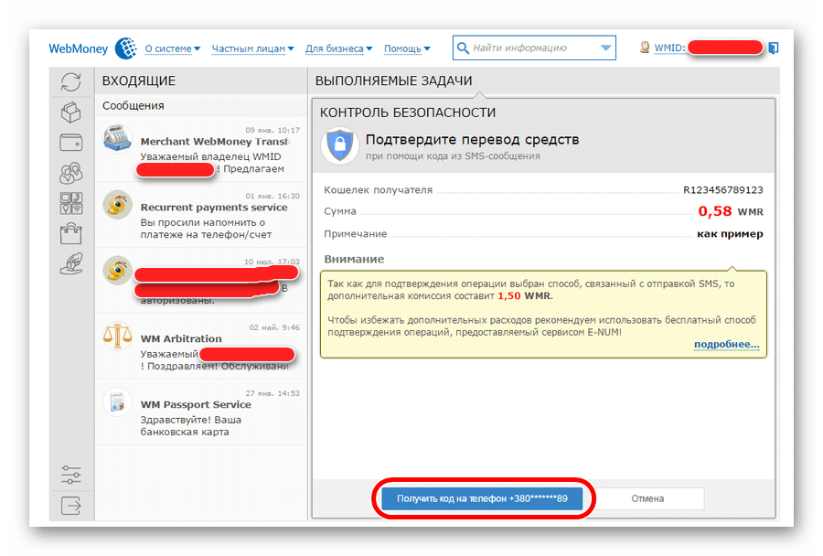 - Введите код, который придет на ваш телефон, указанный при регистрации в Webmoney.