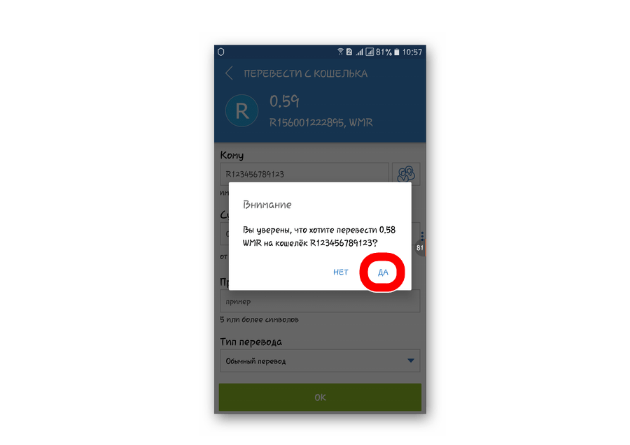 Подтверждение с помощью SMS или E-num здесь не требуется. WebMoney Keeper Mobile сам по себе является подтверждением того, что операцию выполняет именно владелец WMID. Эта программа привязана к номеру телефона и проверяет его при каждой авторизации. Поэтому после предыдущего действия на экране появится только небольшое диалоговое окно с вопросом «Вы уверены…?» Нажмите на надпись «Да».