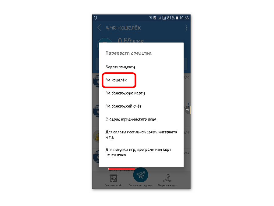 Дальше откроется окно с вариантами перевода. Выберете вариант «На кошелек».