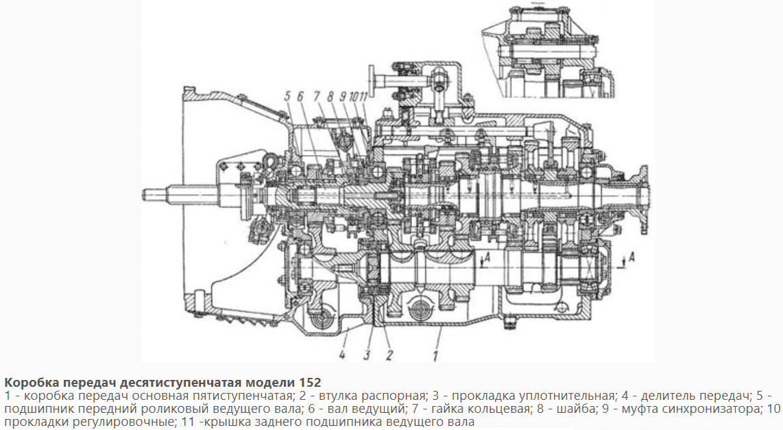 По конструкции десятиступенчатая трансмиссия — коробка с пятью ступенями, дополненная редуктором-делителем. Благодаря устройству транспортное средство может использовать 10 передних передач, а также две задние. Когда было начато производство КамАЗов, рассчитывалось, что эти авто будут работать в условиях высокой грузоподъемности. Инженеры автомобильного концерна создали новую модель трансмиссии, которая получила название 152.