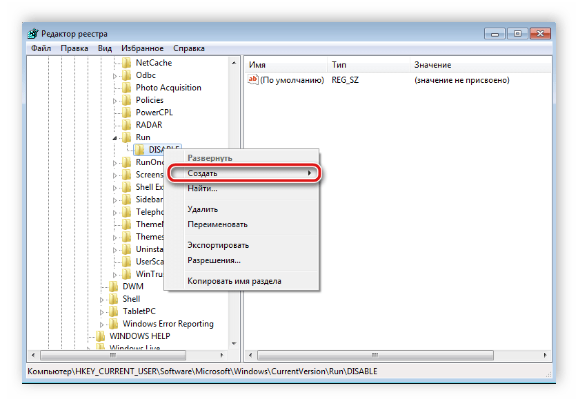 Перейдите по пути, указанному ниже, чтобы найти папку «DISABLE», в которой следует создать новый строковый параметр.