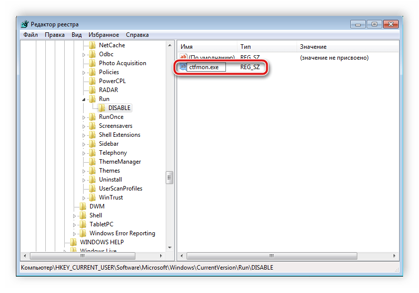 - Открываем созданное значение двойным нажатием, и вводим в поле значение C:\WINDOWS\system32\ctfmon.exe