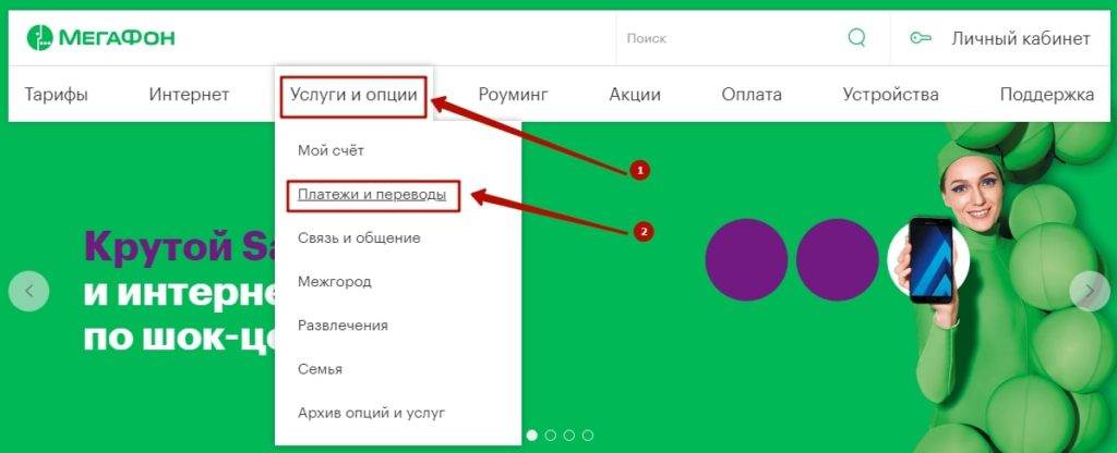 Перекинуть средства со своей симки на другой номер можно через раздел «Услуги», в котором Вашему вниманию откроется целый список доступных разделов. Нужный нам раздел носит название «Мобильный перевод». После этого Вас автоматически перекинут на страницу https://money.megafon.ru, на которой и произойдет отправка средств, после заполнения всех необходимых данных.