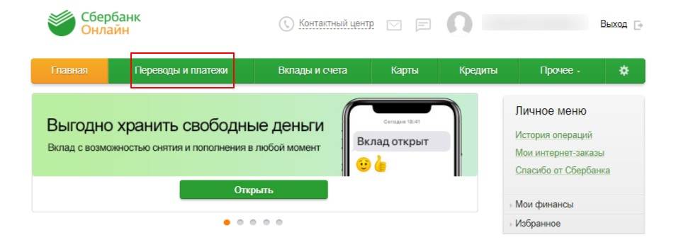 В качестве примера рассмотрим, как перечислить деньги с карты Сбербанка. Для начала войдите в Сбербанк Онлайн и откройте раздел «Переводы и платежи».