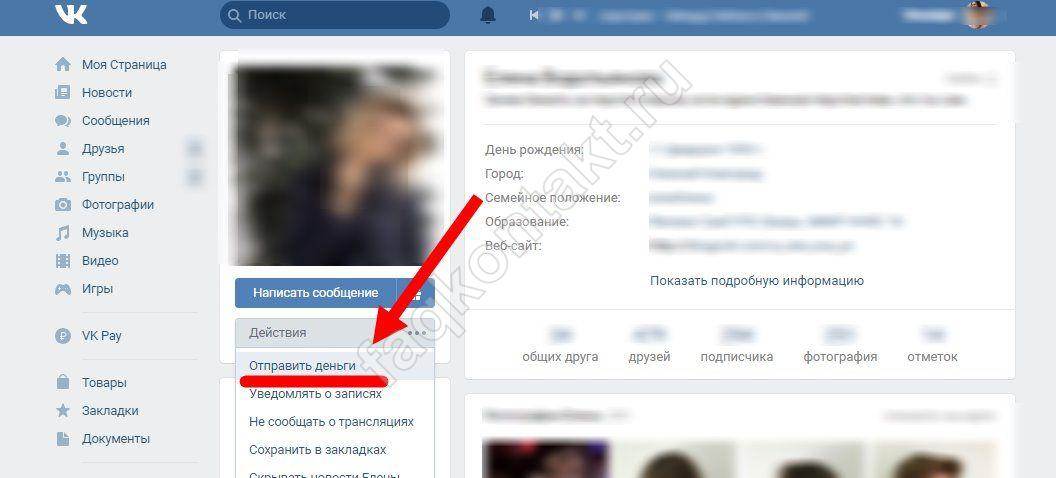 - Зайти на страницу друга, которому желаете отправить деньги, и нажать на кнопку c тремя горизонтальными точками под аватаркой.