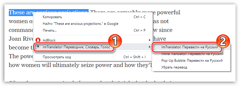 - Установите ImTranslator в Google Chrome. Выделите на сайте фразу, кликните по ней правой кнопкой мыши и выберите пункт «ImTranslator: перевести на русский».