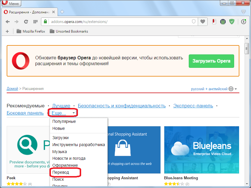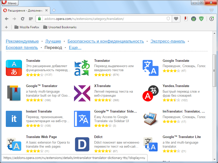 Мы попадаем в раздел, где представлено большое количество расширений для Opera, специализирующихся на переводе. Можно воспользоваться любым из них на свой вкус.