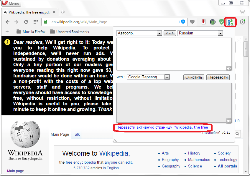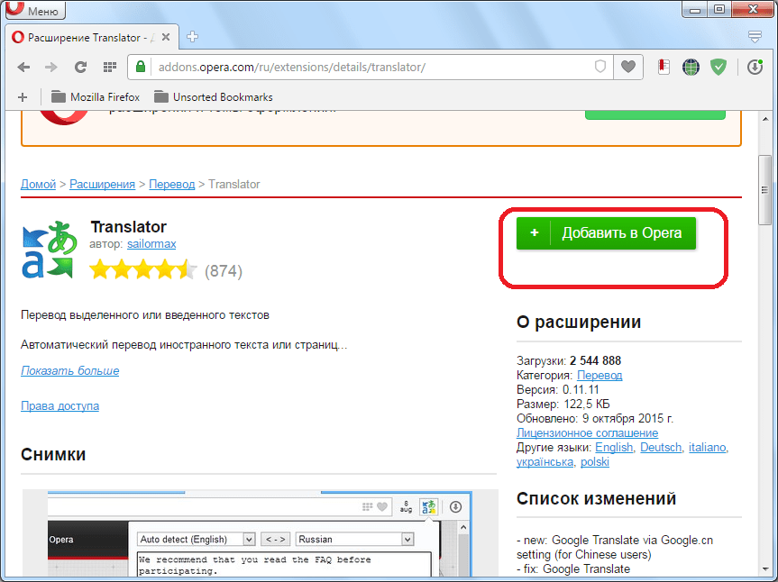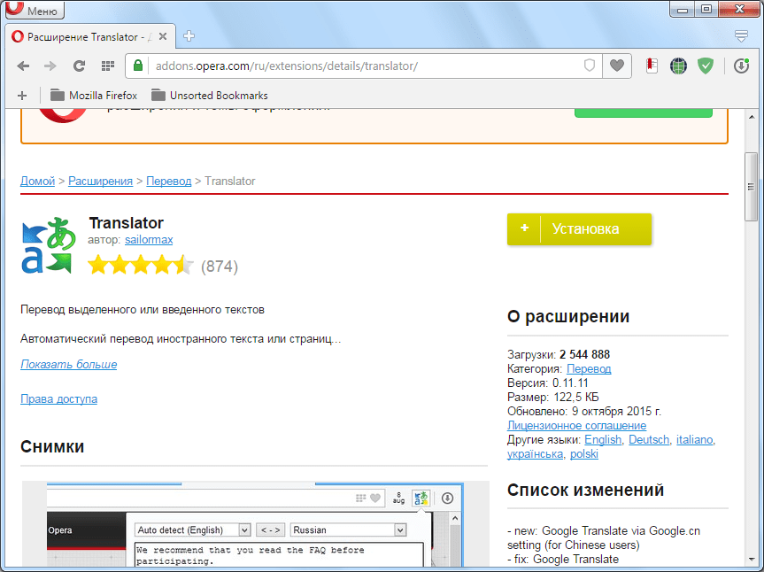 Рассмотрим, как перевести страницу с текстом на иностранном языке на примере популярного дополнения Translator. Для этого переходим на соответствующую страницу в разделе «Перевод».