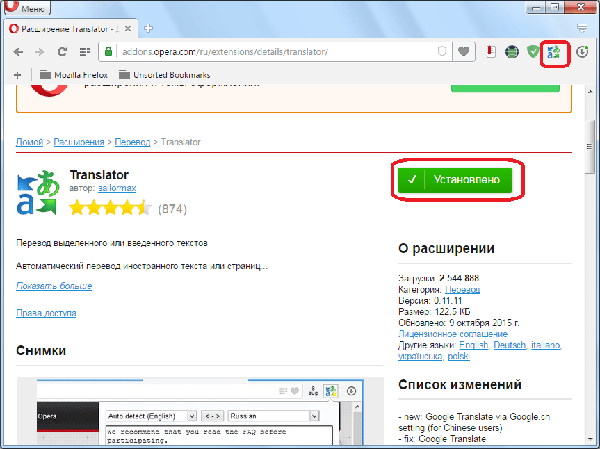 После успешного окончания установки на кнопке, расположенной на сайте, появляется надпись «Установлено», а на панели инструментов браузера – иконка расширения Translator.