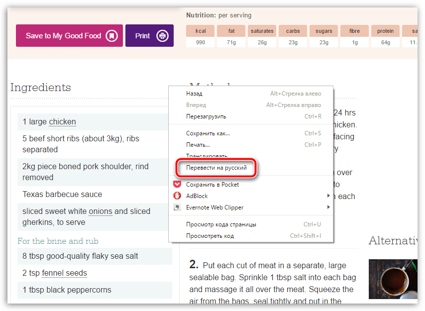 Как правило, при переходе на веб-сайт браузер автоматически предлагает перевести страницу (с чем необходимо согласиться), но если этого не произошло, вы сможете вызвать переводчик самостоятельно. Для этого щелкните на веб-странице по любой свободной от картинок области правой кнопкой мыши и в отобразившемся контекстном меню выберите пункт «Перевести на русский».