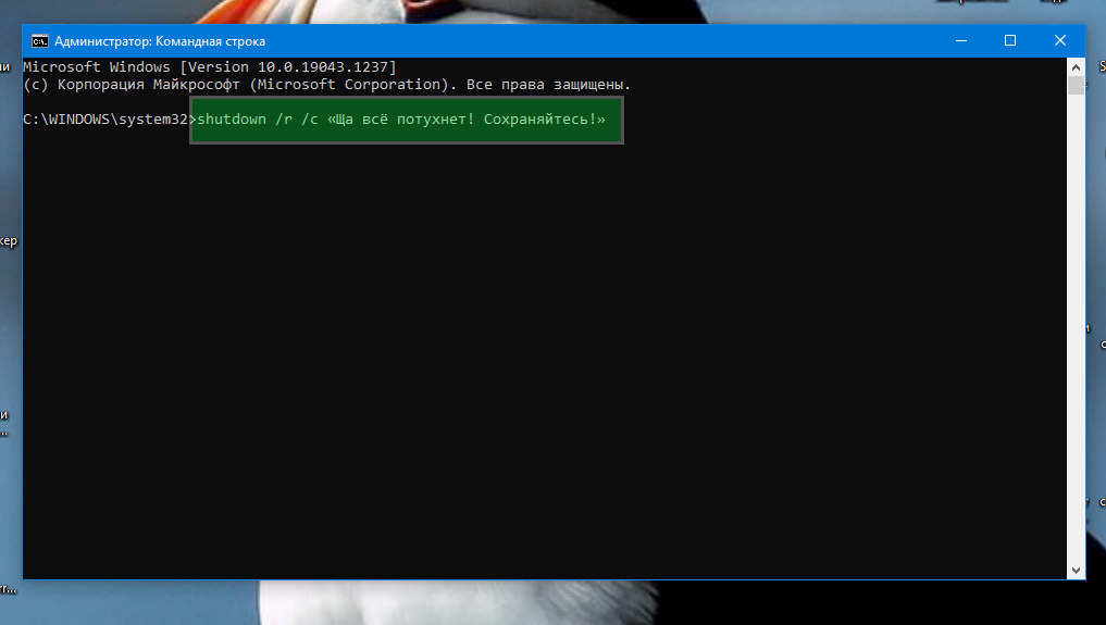 Системным администраторам нередко приходится удалённо управлять компьютерами, расположенными в офисе. И дистанционно выключать они их тоже могут. А чтобы предупредить пользователей о предстоящем выключении, которые сейчас работают за компьютером, можно воспользоваться специальной командой для командной строки:shutdown /r /c «Ща всё потухнет! Сохраняйтесь!»