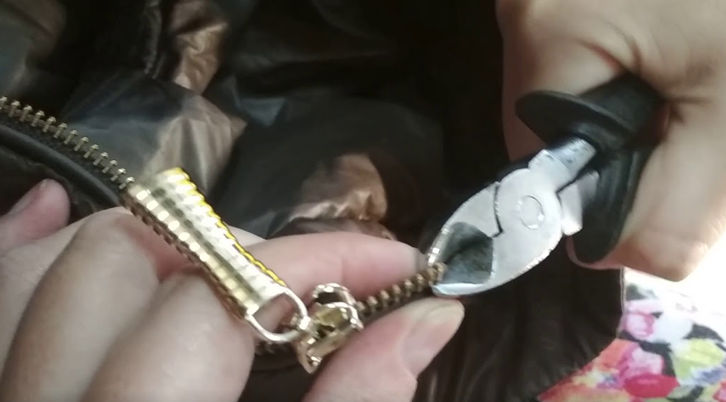 Возьмите плоскогубцы, удалите фиксаторы (специальные ограничители на молнии, благодаря которому слайдер не выпадает произвольно). Если они сделаны из пластика, то их нужно откусить. Если из металла, то отогнуть и аккуратно снять;