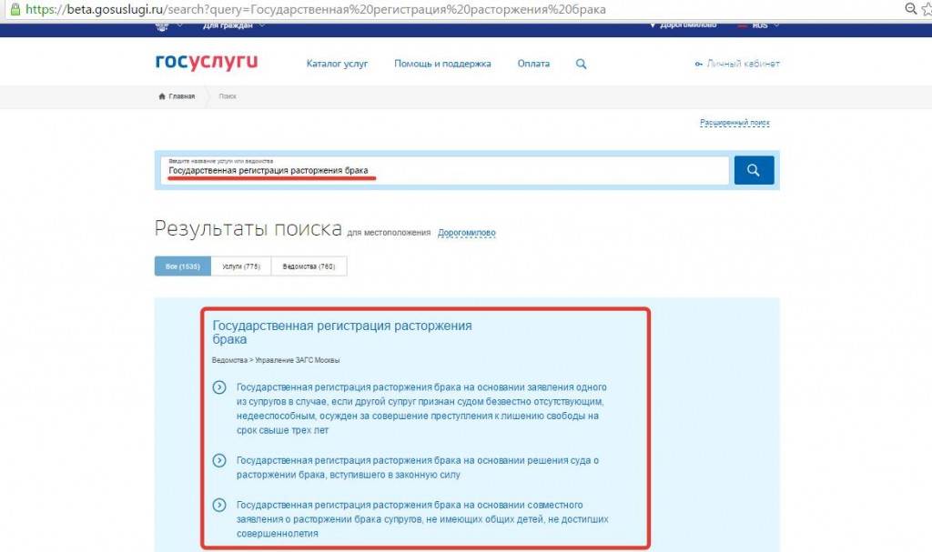 Далее, супругу, намеревающемуся подать заявление о разводе через интернет-портал, потребуется найти требуемую услугу. Проще всего искать услуги на госпортале, пользуясь специальной строкой поиска. Просто введите фразу «расторжение брака», и система выдаст перечень возможных Госуслуг, ведомств, структур и документации, касающихся расторжения брачного союза и относящихся по адресу именно к выбранному пользователем месторасположению.
