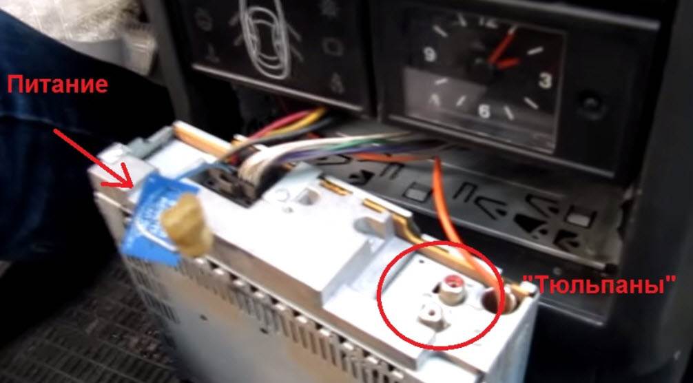 Затем к магнитоле подключаются «тюльпаны» по цветам проводов-соединителей. Чтобы саб включался одновременно с автомагнитолой можно сразу подключить «+» — провод питания.