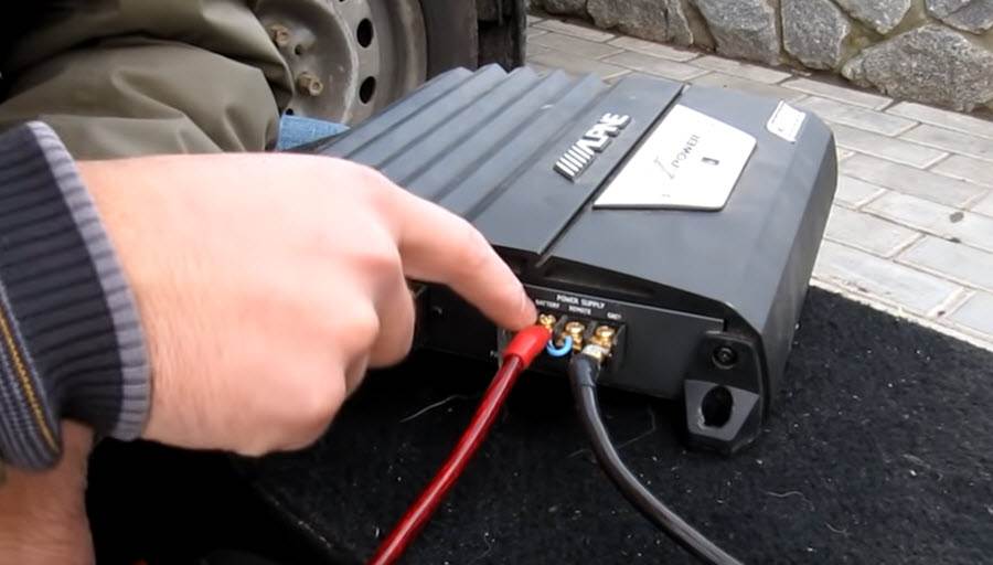 Далее подключаем «черный» и «красный» провод в «-» и «+» контакты усилителя соответственно.