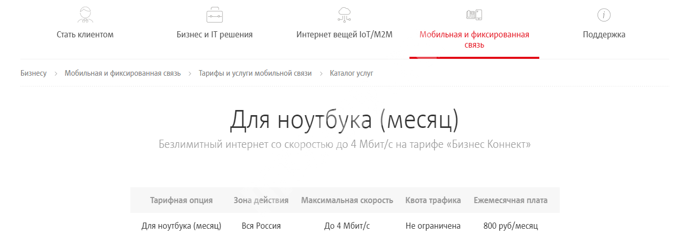 Если вы не знаете, какой выбрать безлимитный Интернет для ноутбука от МТС, цену услуги можно посмотреть на сайте в разделе с тарифами на мобильную связь. Рекомендуем пакет «Для Ноутбука» по 800 р. в месяц со скоростью передачи 4 Мбит/сек.