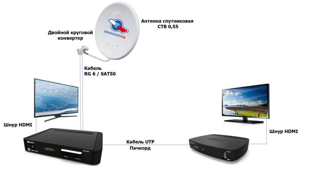 Для передачи изображения Триколор ТВ на 2 телевизора используют два независимых комплекта, которые устанавливают вместе или докупают второй позже. Каждая антенна передает сигнал на отдельный ресивер, подключенный к выбранному телеприемнику. Преимущество — устройства работают независимо и каждый член семьи сможет смотреть выбранный телеканал.