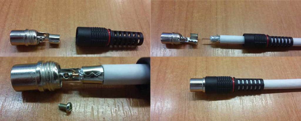 Соединить штекер с кабелем можно собственными силами, тем более, что напряжение ТВ-сигнала слишком мало, чтобы нанести какой-либо вред здоровью. Даже не отключенный кабель разделывается, не боясь удара током. Не несет никакого вреда также и закорачивание промеж оплеткой и главной жилой