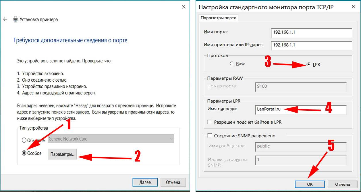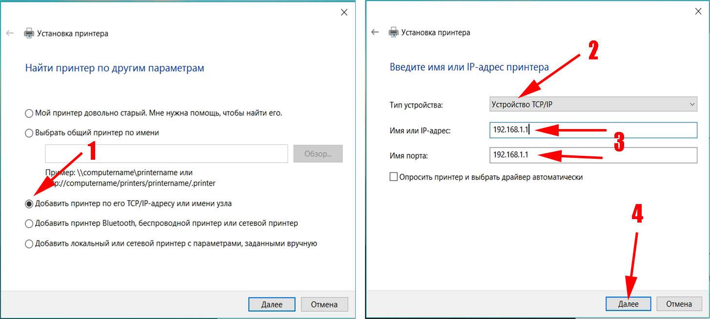 5 Выберите «Тип устройства: Устройства TCP/IP», в двух ниже разделах пропишите «192.168.1.1 или 192.168.0.1 (это IP адрес вашего роутера)» IP-адрес вы можете посмотреть на наклейке роутера, при условии что вы его самостоятельно не меняли. Жмем «Далее».