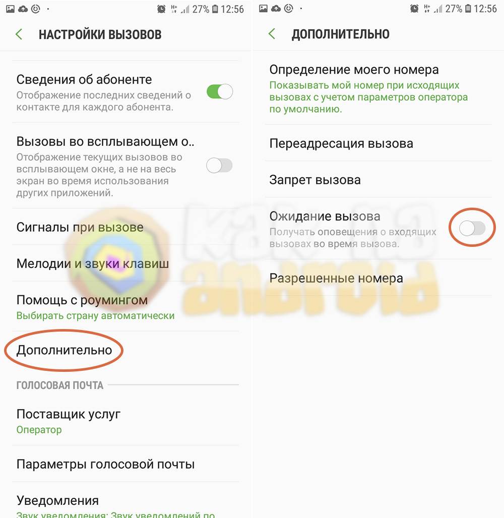 В открывшемся окне нажимаем на “Дополнительно” и активируем переключатель возле пункта “Ожидание вызова”.