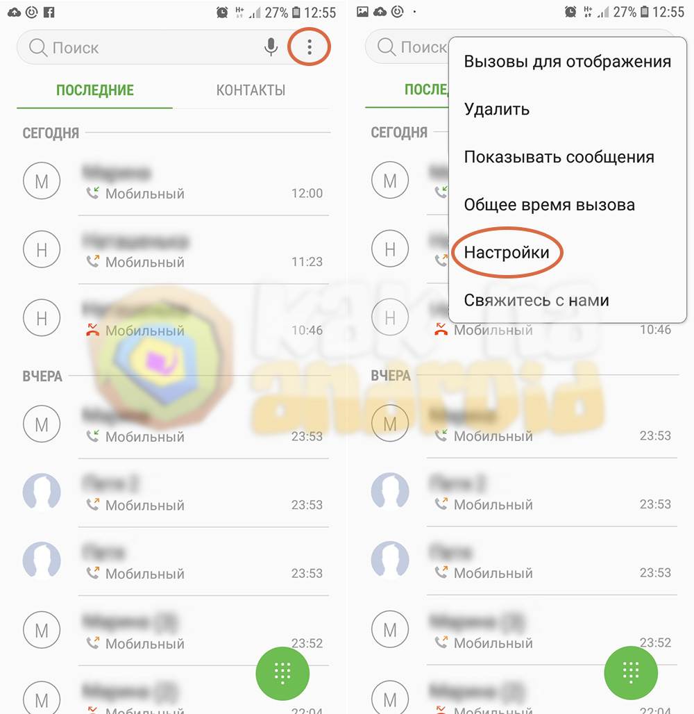 Открываем приложение “Телефон” и вызвав меню через троеточие нажимаем на пункт “Настройки”.