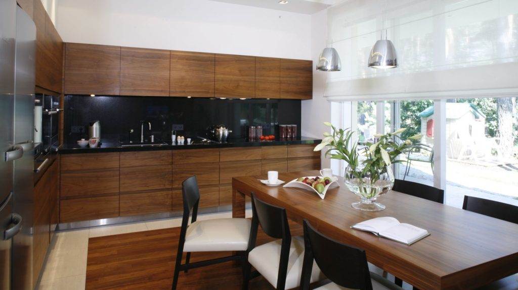 Если вы не определитесь с ними по цветам стен, то выбирайте в них дополнения. Современные кухни (и интерьеры в целом) — это выразительные цвета или контрасты. Темная или коричневая мебель для кухни может быть очень разной.