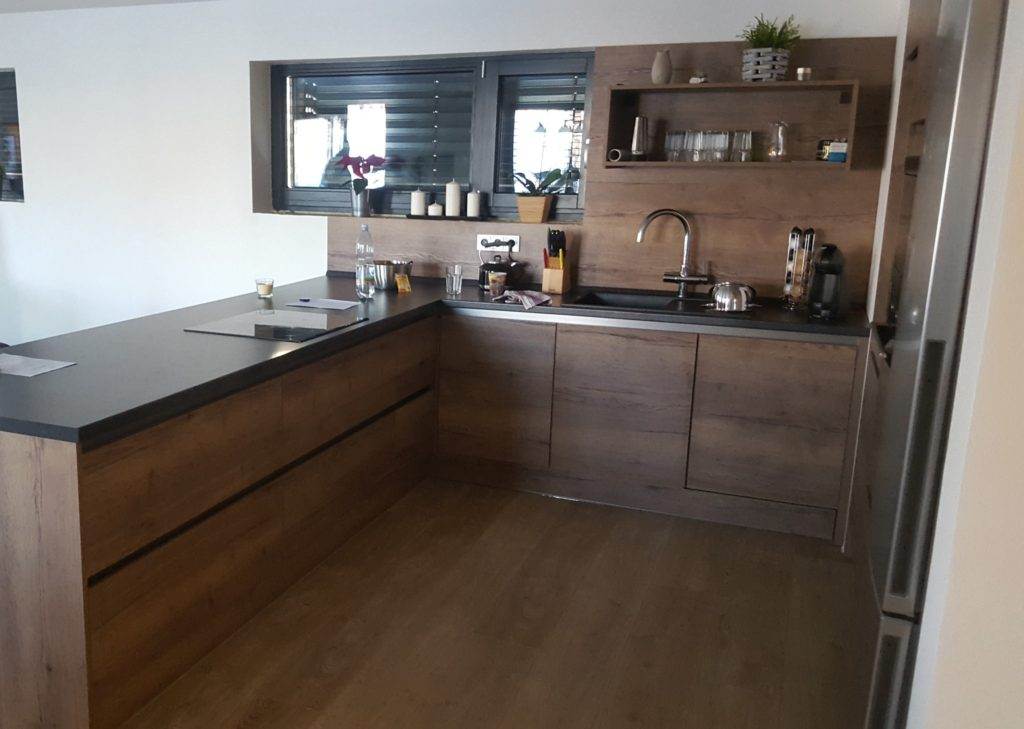 Благородный цвет дерева отлично сочетается со светлыми тонами: белый, серый, бежевый, под мрамор, бледно-зеленый и др. Строгости кухни добавит темный фартук: черный, графитовый, темно-коричневый.