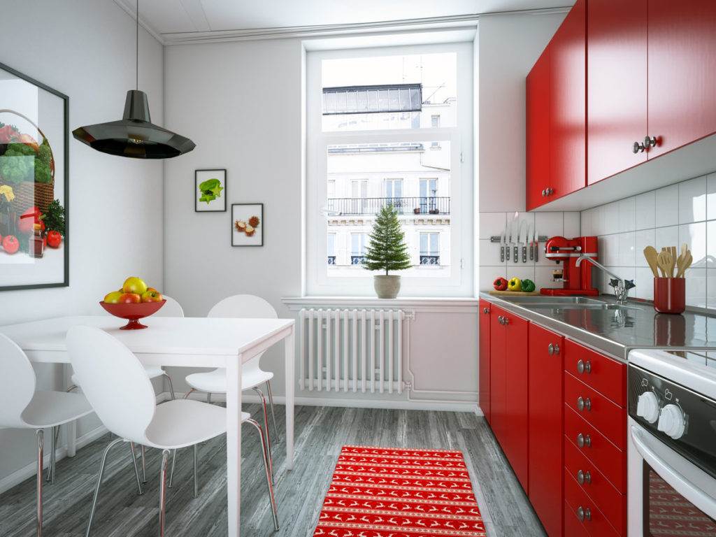 Красные шкафы в сочетании с белыми столешницами, делают ее просторной и придает свежий вид