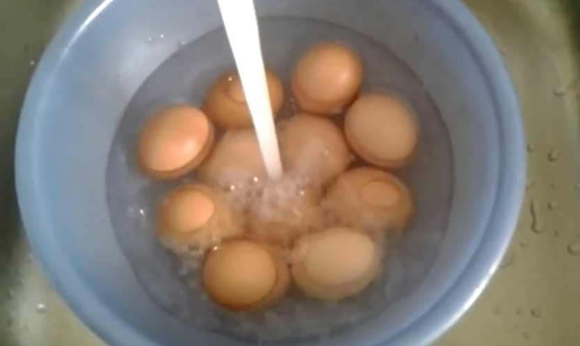 - Положить яйца в шелухе под воду с зеленкой таким образом, чтобы их было хорошо видно.