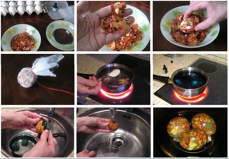 - Вынимать яйца по одному и в мокром состоянии обваливать в нарезанной шелухе.