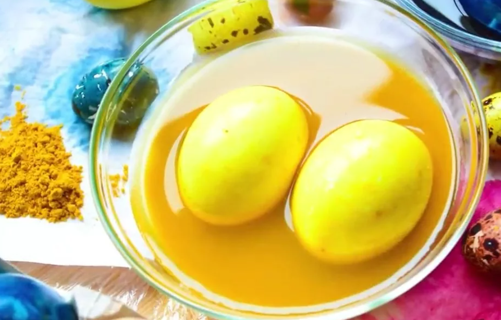 Заранее сварите яйца вкрутую. В глубокую миску налейте 1,5 л кипятка, всыпьте туда 4 ст.л. куркумы, 3 ст.л. соли и 3 ст.л. белого спиртового уксуса, перемешайте. В эту жидкость опустите яйца и достаньте их, когда скорлупа окрасится в желтый цвет. Для получения интенсивного оттенка нужно подождать не менее 2 часов.