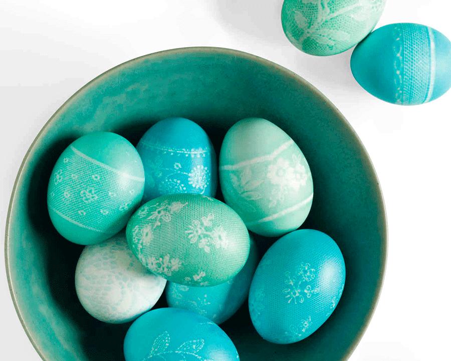 Можно сделать очень красивые пасхальные яйца, покрасив их с помощью кружев.