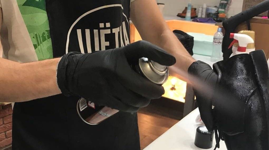 Нубук не любит намокания, поэтому его лучше очистить сухим методом. Грязные пятна нужно обязательно обработать мыльным или спиртовым раствором. Перед покраской ботинки должны быть сухими. Обувь из этого материала обрабатывают только методом распыления. Главный совет – держать баллон на расстоянии 20 см от поверхности.