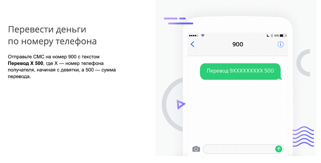 СМС с командой о переводе на карту другого клиента выглядит следующим образом: «Перевод 9000000000 100».