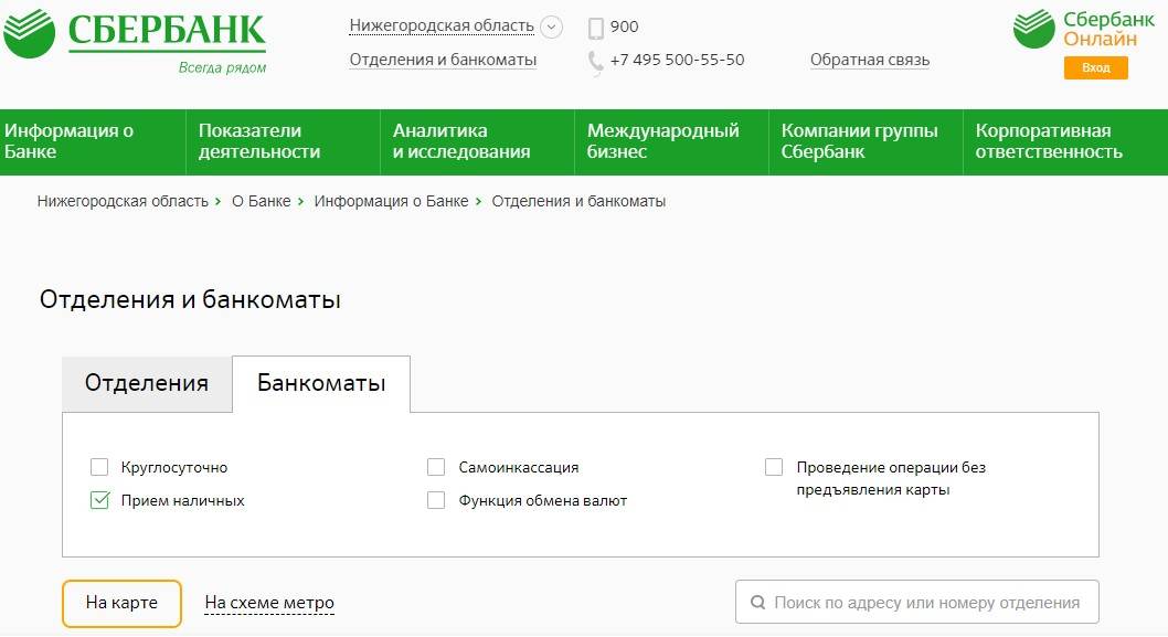Найти устройство с поддержкой cash in можно с помощью сайта Сбербанка или визуально по наличию соответствующей надписи/картоприемника