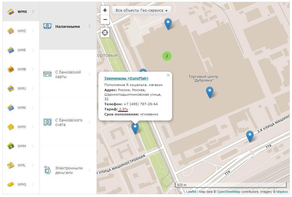 На официальной странице Webmoney показаны абсолютно все терминалы, работающие с WM кошельками. Здесь же можно узнать размер комиссии за пополнение счета, кликнув на определенный терминал: