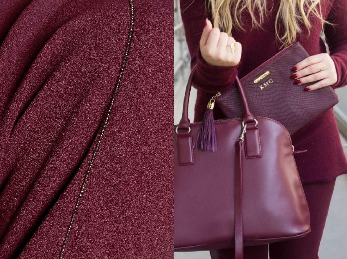 В модной индустрии бордо ассоциируется с респектабельностью, определенным уровнем достатка. Он прекрасно сочетается с золотым оттенком. Насыщенный цвет бордовых роз, дорогое вино в бокале – это антураж цвета. Его часто используют для вечерних нарядов.