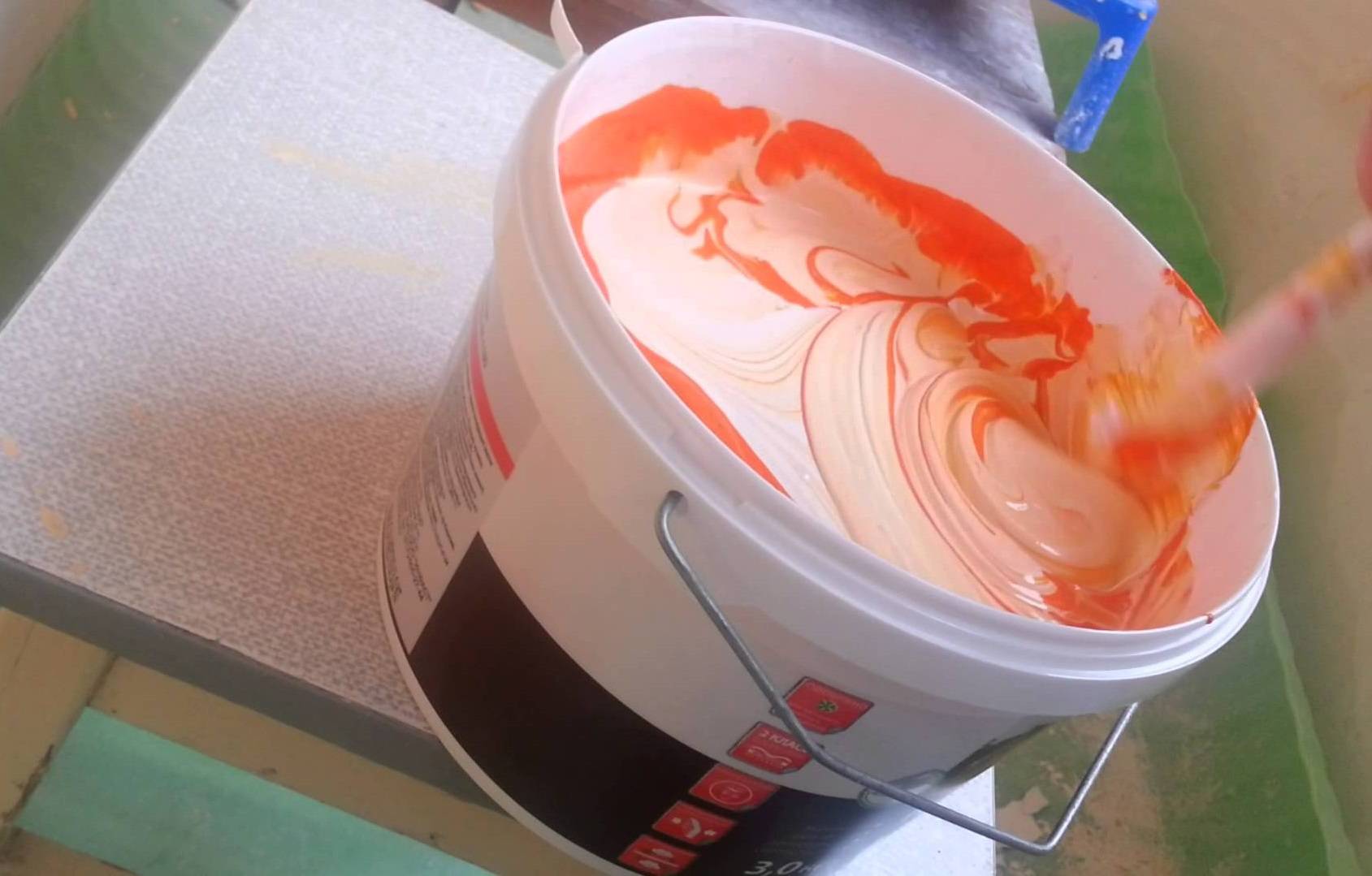 Если вас все устраивает, смешайте основную порцию краски. Рекомендуется сделать ее менее яркой, уменьшив долю добавочного оттенка на 20%. На небольшой поверхности тон выглядит более насыщенным, чем на большой. Этап с проведением теста обязателен, поскольку в емкости цвет тоже кажется не таким ярким.