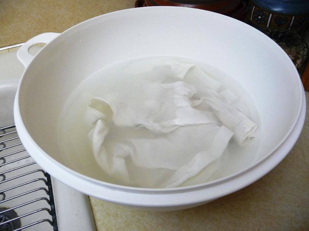 налить в тазик прохладной воды и добавить отбеливатель (на 3,5 литра не более 1 ст