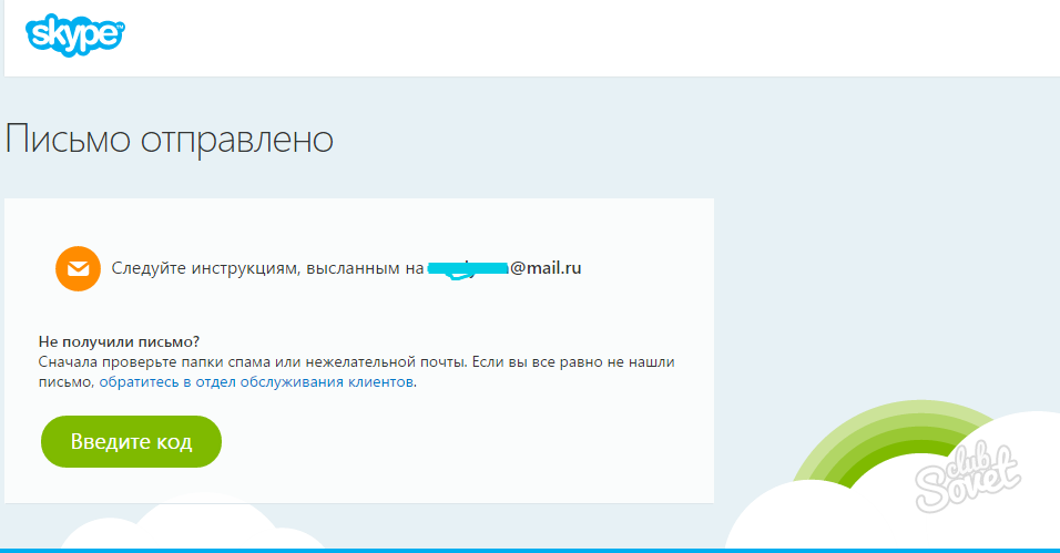 После чего на указанный вами почтовый ящик должно прийти сообщение, содержащее этот код. Проверьте почту, если во входящих письмах вы не обнаружите письма от службы скайп, проверьте также папку спама. Если письмо так и не пришло по каким-то причинам, обратитесь в отдел обслуживания Skype . Обычно это сообщение приходит без проблем, в течение 2-5 минут. Далее в диалоговом окне скайпа нажмите «Ввести код».