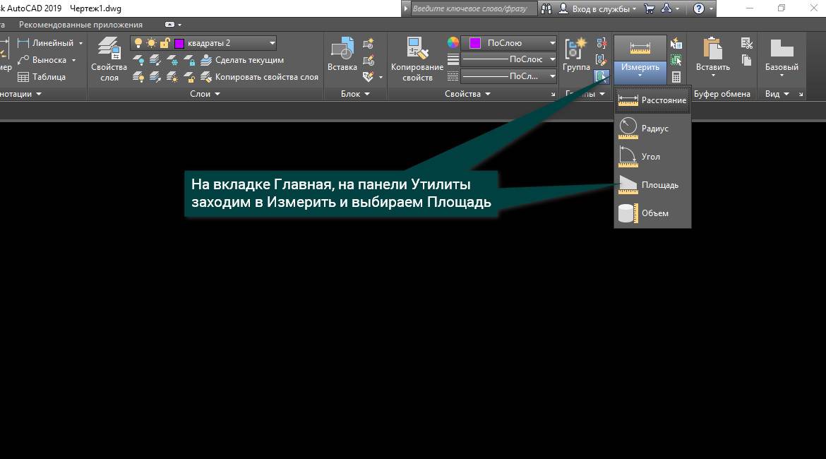 Определить площадь в Автокаде можно с помощью стандартного инструмента, который расположен на вкладке «Главная» — панель «Утилиты» — вниз спадающий список «Измерить» — команда «Площадь» (см. рис.).