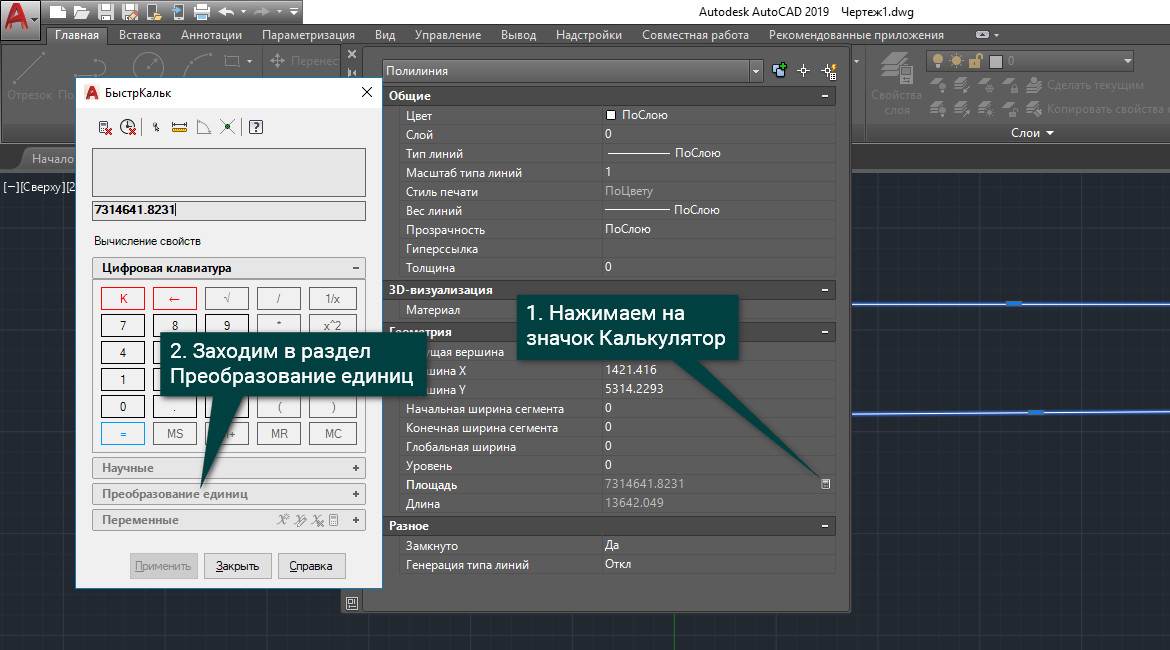 Журнал командной строки можно несколько увеличить путем растягивания его границ с помощью мышки. Далее находим нужное значение площади/периметра, копируем его (Ctrl+C) и вставляем значение в калькулятор. Здесь следует немного поработать со списком «Преобразование единиц» (см. рис.).