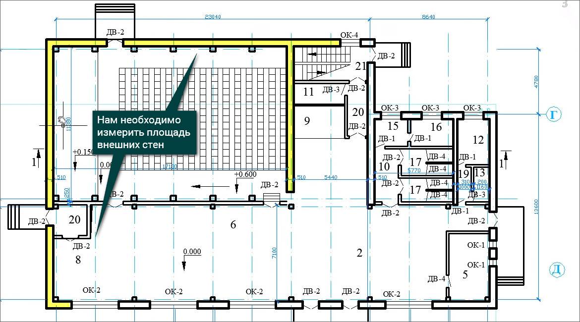 Нажимаем Вычесть площадь, далее Объект и выбираем ненужный нам объект. Теперь рассмотрим более динамичный и интерактивный подход определения площади. У нас есть план 1 этажа, и мы хотим измерить площадь наружних стен, которые построены при помощи полилиний и отдельных отрезков.