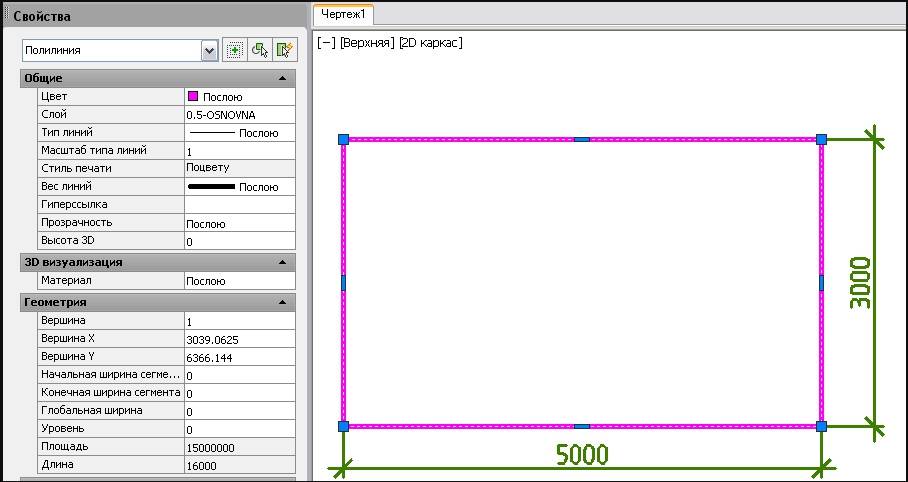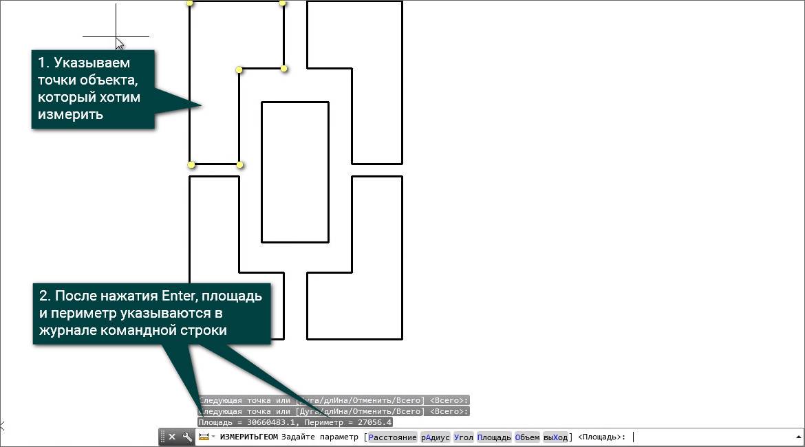 Итак, после выбора команды следует указать точки по периметру фигуру. Значение площади отобразится в Журнале командной строки. Там же появится и периметр объекта. Не пугайтесь столь большим значениям. Все дело в том, что площадь отображается в мм2. Немного позже рассмотрим, как ее переводить в м2.