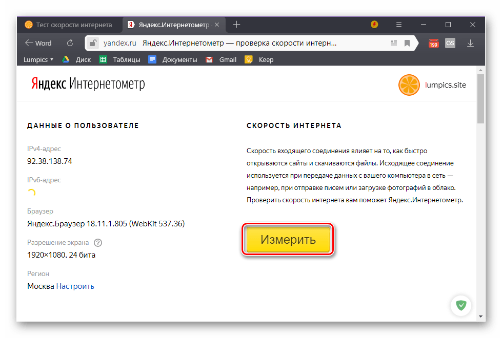 Для запуска проверки нажмите кнопку «Измерить». Результат, как и у конкурентов, появляется на экране через 1-2 минуты.